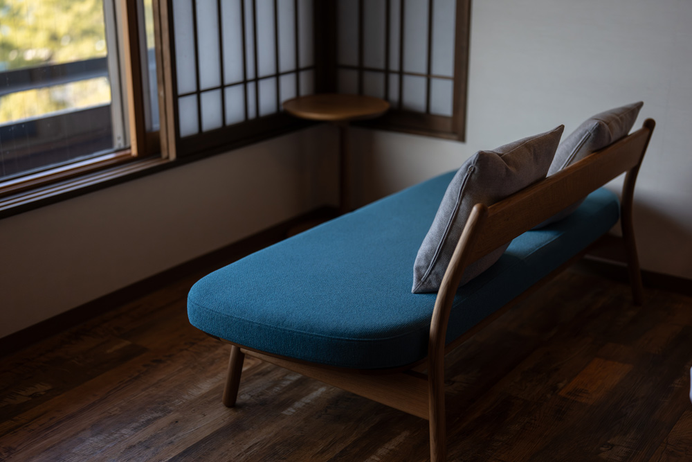 素足でゆっくりくつろげる板の間。小上がりに3つの寝具+心地よいソフアはベッドに早替り、37㎡の広さの客室は、使い勝手と心地よさにこだわった、