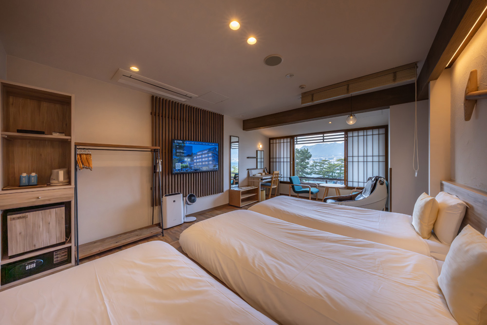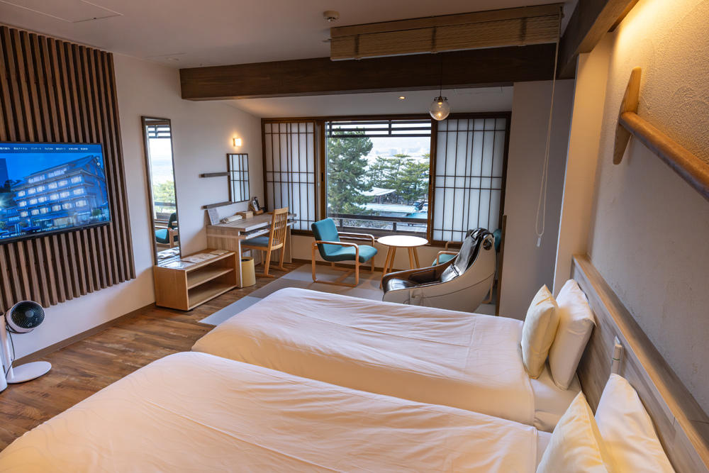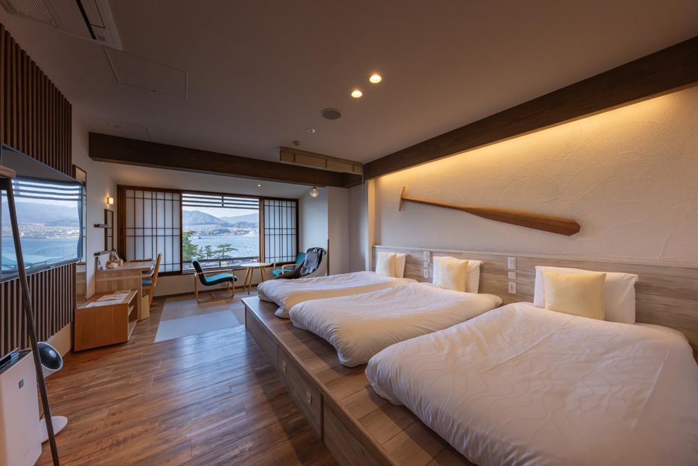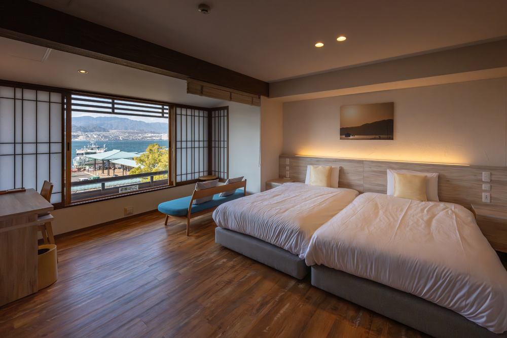 宮島の「町家・海・山」をイメージした和モダンな客室でゆったりと客室は、全室ベッドスタイル。