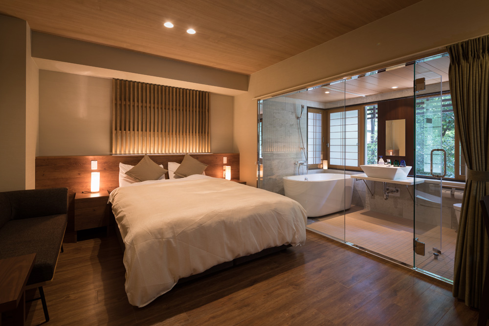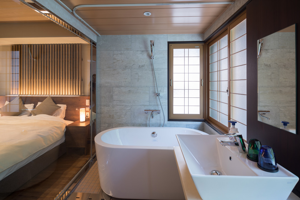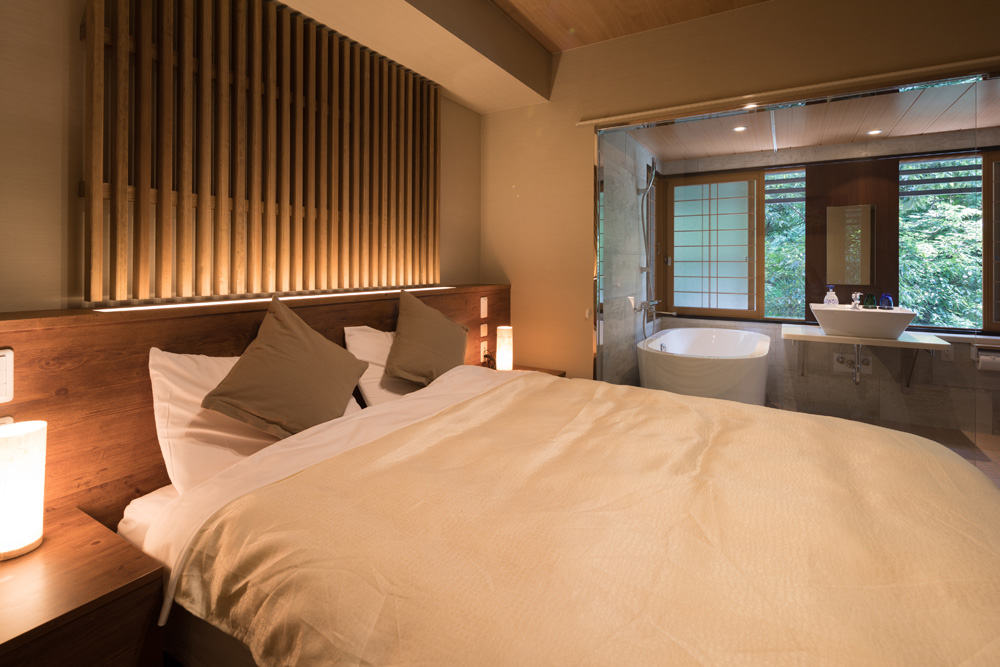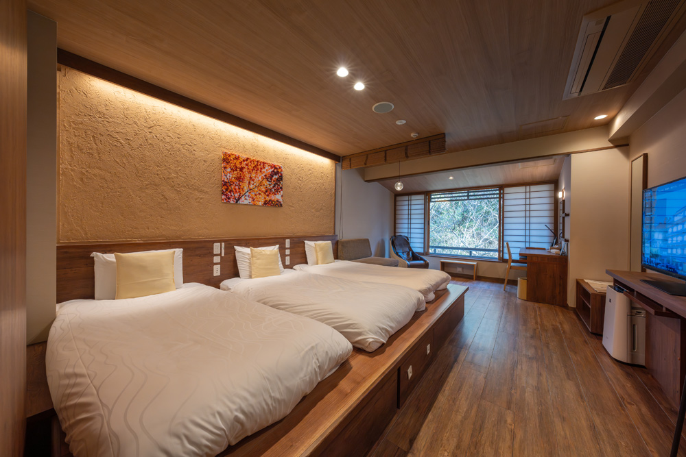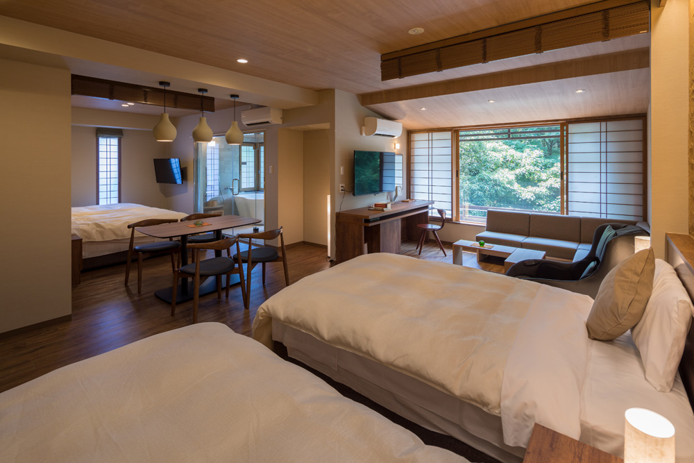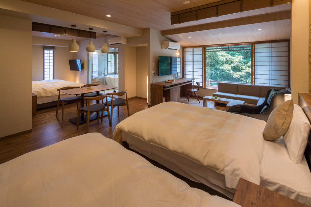 山側に面したビューバスを完備し、ゆったりと寛ぐことができます。4ベッドタイプのため、ご家族やグループでの滞在が可能です。