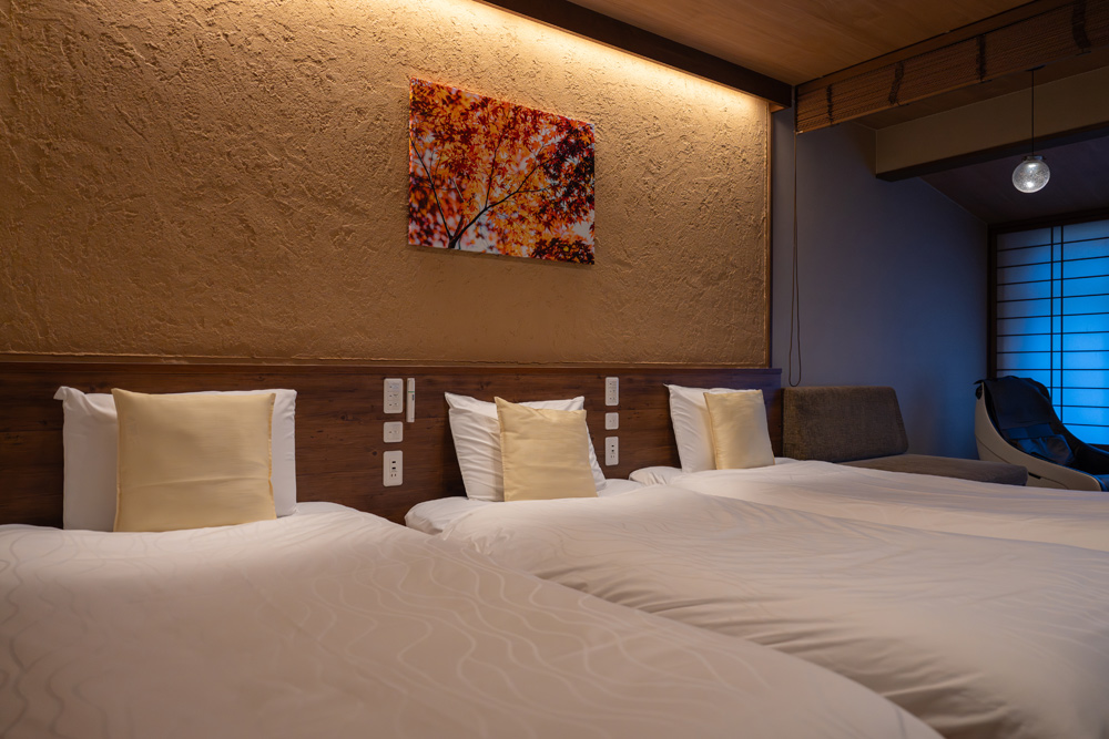 小上がりに3つの寝具+心地よいソフアはベッドに早替り、37㎡の広さの客室は、使い勝手と心地よさにこだわった、