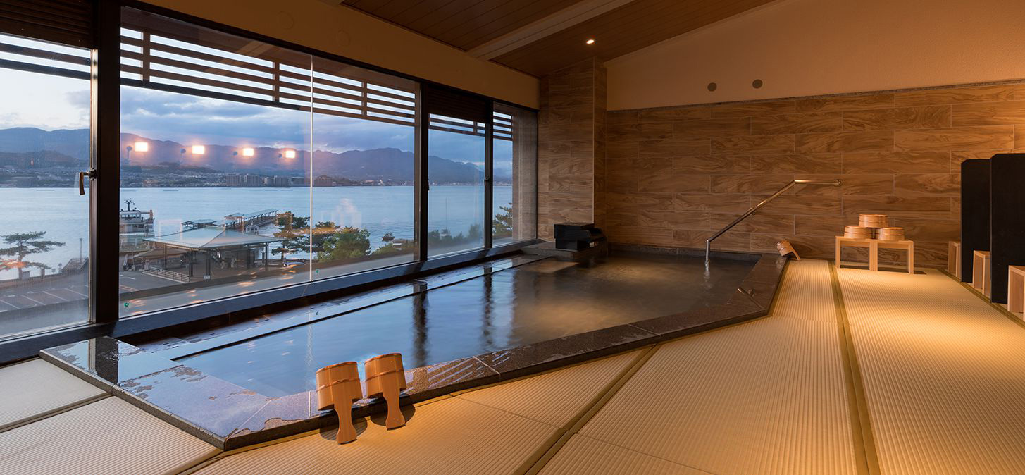 ホテル宮島別荘の温泉は、宮島初の浴室の中に防水の畳を敷いた、瀬戸内海を望む展望風呂です。